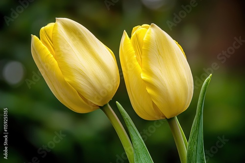 Two Bright Yellow Tulips with Soft Petals Against a Blurred Green Background