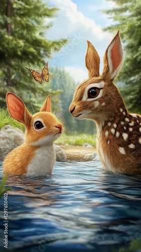 Two Brown Rabbits Enjoying a Stream in a Lush Forest