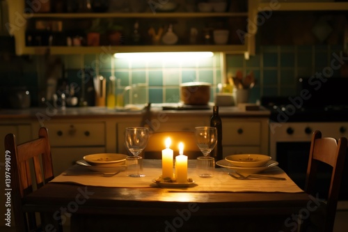 Two burning candles illuminate a romantic dinner setting for two in a cozy, rustic kitchen