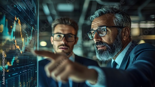 Two business colleagues standing in a glass walled meeting space pointing at and analyzing a data presentation or chart displayed on a large screen