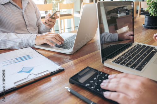 Two business persons working at office desk and discussing using laptop to ideas of project about company offer, they is pointing on a contract and giving explanations, team of successful people