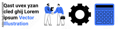 Two business professionals shaking hands symbolizing collaboration, next to a gear for strategy and a calculator for planning. Ideal for business, teamwork, productivity, partnership, finance