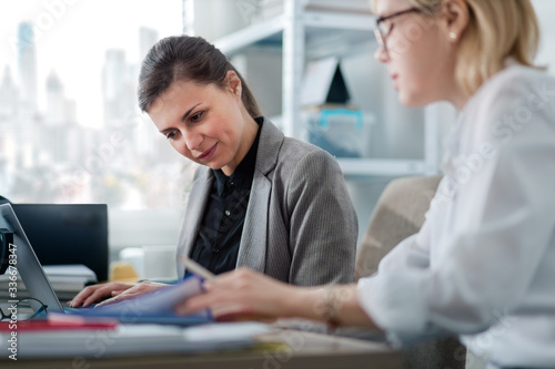 Two business women working on a project. Relaxed meeting in a busy office downtown.