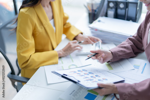 Two businesswomen are discussing over financial data displayed on a clipboard, showcasing teamwork and data-driven decision-making in a corporate setting