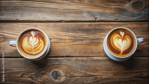 Two cappuccinos with heart latte art on rustic wooden table, coffee, beverage, cappuccino, latte art, heart, rustic, wooden table