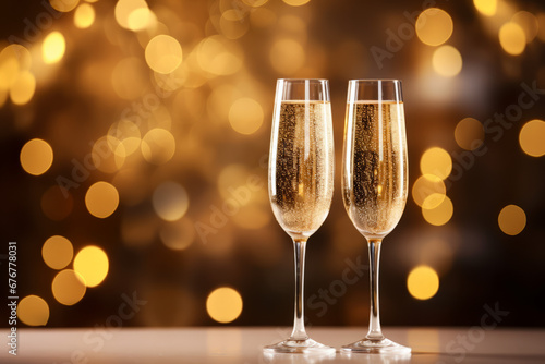 Two champagne flutes on a table with captivating lights in the background.