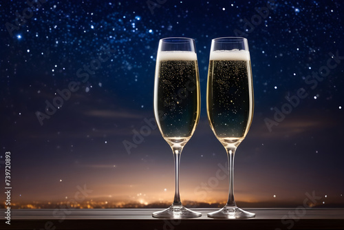 Two Champagne glasses, against the night sky. Generative AI