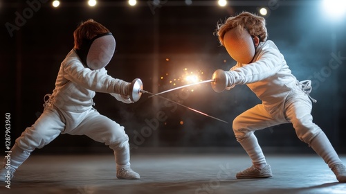 Two children engage joyfully in fencing, dressed in protective gear, illustrating the spirit of competition and play in a lively and fun-filled environment.