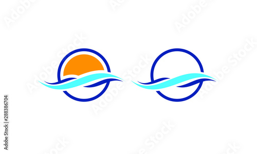 Two circular logos featuring stylized waves and a sun or empty space