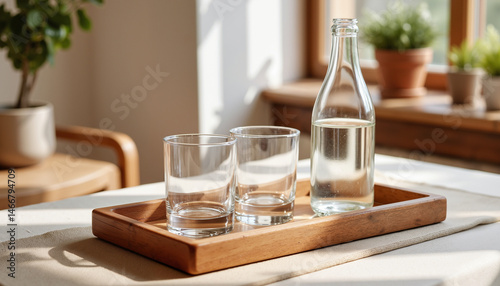 Two clear glasses and a glass bottle filled with water are arranged on a wooden tray in a sunlit room, creating a fresh and inviting atmosphere