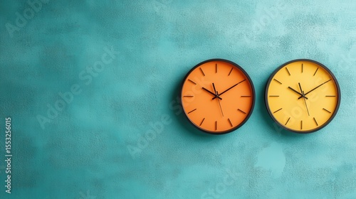 Two colorful clocks on a textured turquoise wall capture the essence of time, beauty, and the playful interaction of color within our daily lives and schedules.