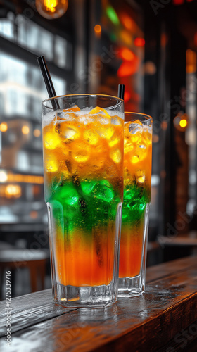 Two colorful layered cocktails with ice in tall glasses at a bar.