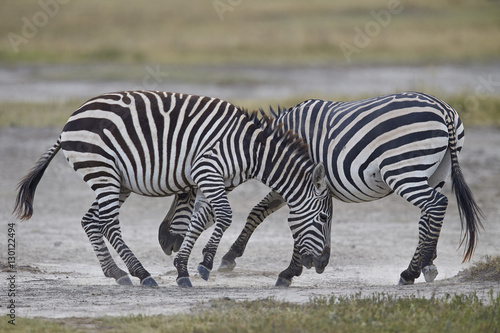 Two common zebra (Plains zebra) (Burchell's zebra) (Equus burchelli) sparring, Ngorongoro Crater, Tanzania
