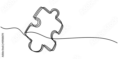 Two connected puzzles line art. Jigsaw pieces continuous one line drawing. Vector isolated on white, An illustration illustrating a puzzle piece drawn in one continuous line. This is a jigsaw puzzle