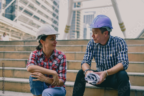 Two construction professionals discussing plans on stairs in an urban setting, showcasing teamwork and collaboration.