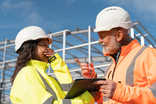Two construction workers discuss plans on a site while wearing safety gear and reviewing documents