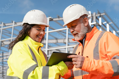 Two construction workers discuss plans on a site while wearing safety gear and reviewing documents
