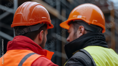 Two Construction Workers in Orange Helmets Discussing Project at Busy Construction Site