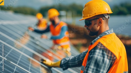 Two construction workers in safety gear and uniforms working together to install solar panels on the rooftop of a building