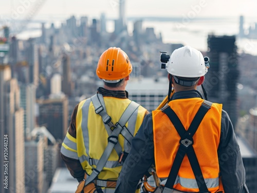 Two construction workers in safety gear gaze at the city skyline, showcasing teamwork and urban development.