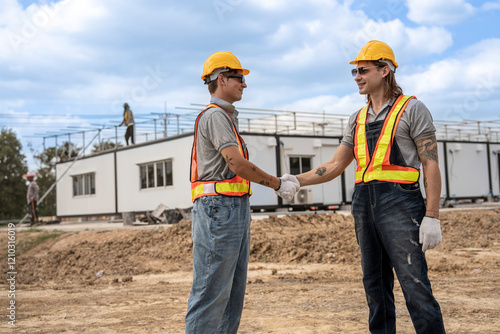 Two construction workers wearing hard hats and safety vests shaking hands at a construction site, symbolizing collaboration and successful teamwork with modular units in the background.