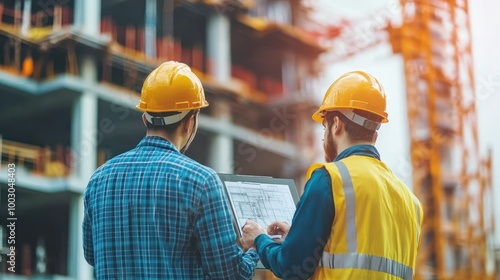 Two construction workers, wearing helmets and using a digital tablet, are reviewing plans while working at an industrial site. This image represents the importance of teamwork in construction.