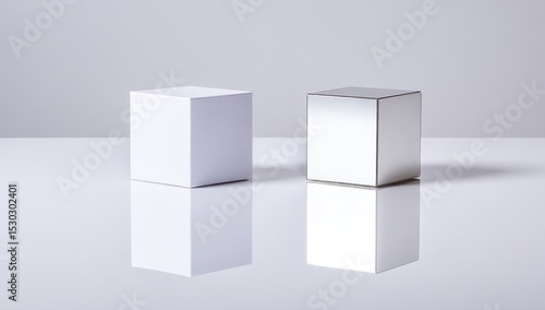 Two cubes, white and metallic, on a reflective surface