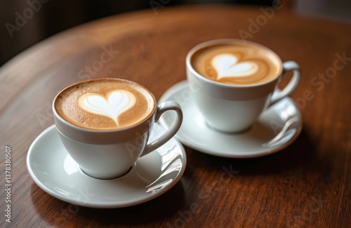 Two cups hot latte coffee with heart-shaped latte art. Romantic Valentine Day concept for coffee lovers. Morning drink in cafe. Delicious caffeine beverage with milk froth foam on wooden table.