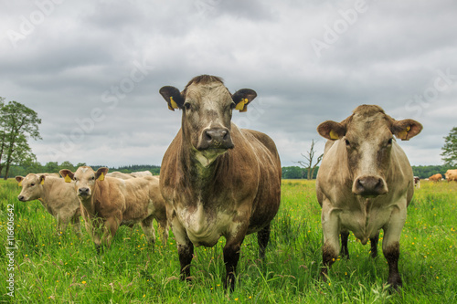 Two curious adult cows and two calves are observing the photographer from a natural meadow with long green grass and dark rain clouds