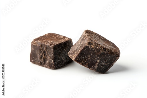 Two dark chocolate squares, angled, on white background. Close-up view of textured surfaces