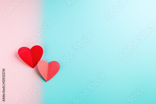Two Decorative Red Paper Hearts on a Split Pink and Blue Background - Copy Space