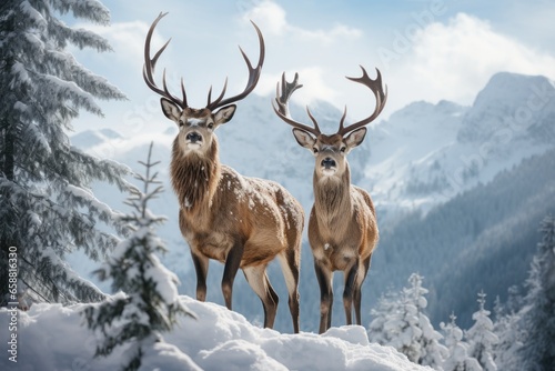 two deer standing in the snow on mointains covered landscape, in the style of mysterious backdrops