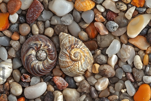 Two detailed seashells sit among smooth pebbles in this textured nature scene
