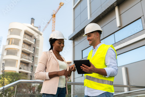 Two diverse Construction workers discussing building plans using tablet at construction site