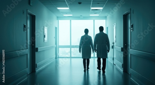 Two doctors walking down a dimly lit hospital corridor towards a bright large window at the end of the hallway