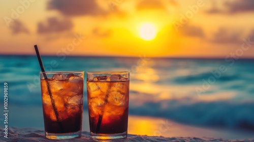 Two drinks with ice sit on the beach as the sun sets over the ocean.