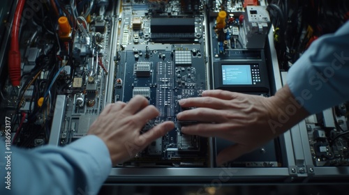 Two electronics engineers collaborating on a complex circuit board in a high tech manufacturing environment, highlighting expertise and teamwork amid intricate components