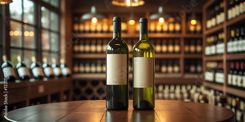 Two elegant wine bottles with blank labels placed on a wooden table in a stylish wine shop, warm lighting creating a luxurious and sophisticated atmosphere, perfect for branding mockups