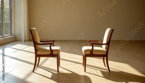 Two elegant wooden armchairs with cream upholstery face each other in a sunlit, minimalist room with large windows and light wooden flooring.