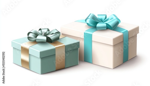 Two elegantly wrapped gift boxes with satin ribbons, one blue with gold and the other cream with blue, displayed on a white background.