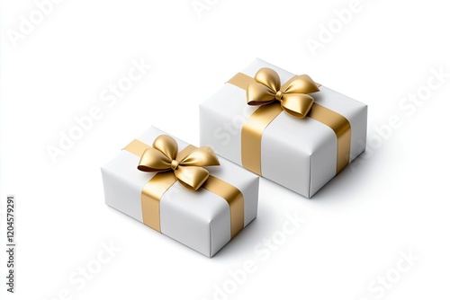 Two elegantly wrapped white gift boxes with golden ribbons, set against a clean white background