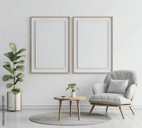 Two empty frames in a minimalist living room with an armchair. coffee table. and potted plants