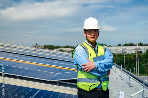 Two energy engineers are discussing and inspecting solar panel installation on the roof for performance standards. Controlling Cutting-Edge Technology for Clean, Green Energy Solutions.