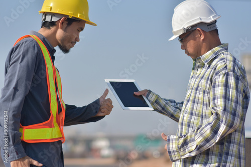 Two Engineering using tablet technology checking inspection work construction and talking planing project management