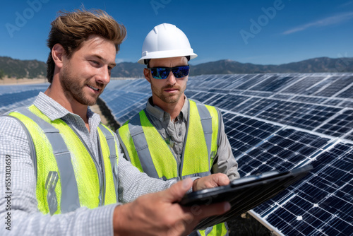 Two engineers analyzing data on a tablet at a solar farm on a sunny day