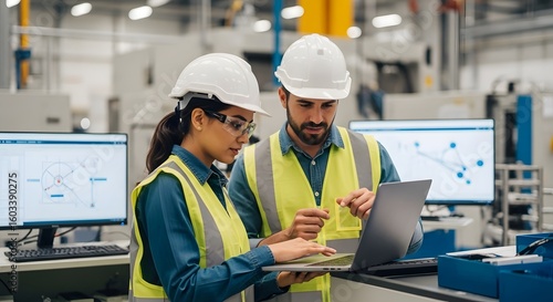 Two engineers collaborate on a laptop, reviewing blueprints on nearby computer screens within a modern industrial factory setting.