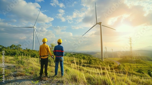 Two engineers discussed the plan for the maintenance of wind turbines. Renewable energy with wind generator by alternative energy concept in Asia