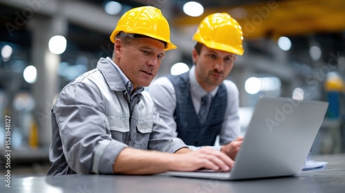 Two Engineers in Hard Hats Working on a Laptop in a Factory, Illustrating Modern Collaboration and Industrial Innovation for Business Solutions : Generative AI