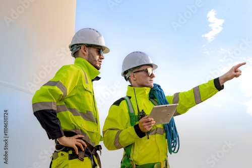 Two engineers in high visibility gear and hard hats observe a wind turbine and communicate via radio at a wind energy site. The image highlights teamwork, safety, and renewable energy production.