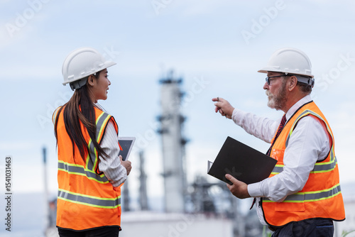 Two engineers in safety vests and helmets discuss operations at an oil refinery site. One holds a walkie-talkie while the other points toward the facility, emphasizing teamwork and coordination.